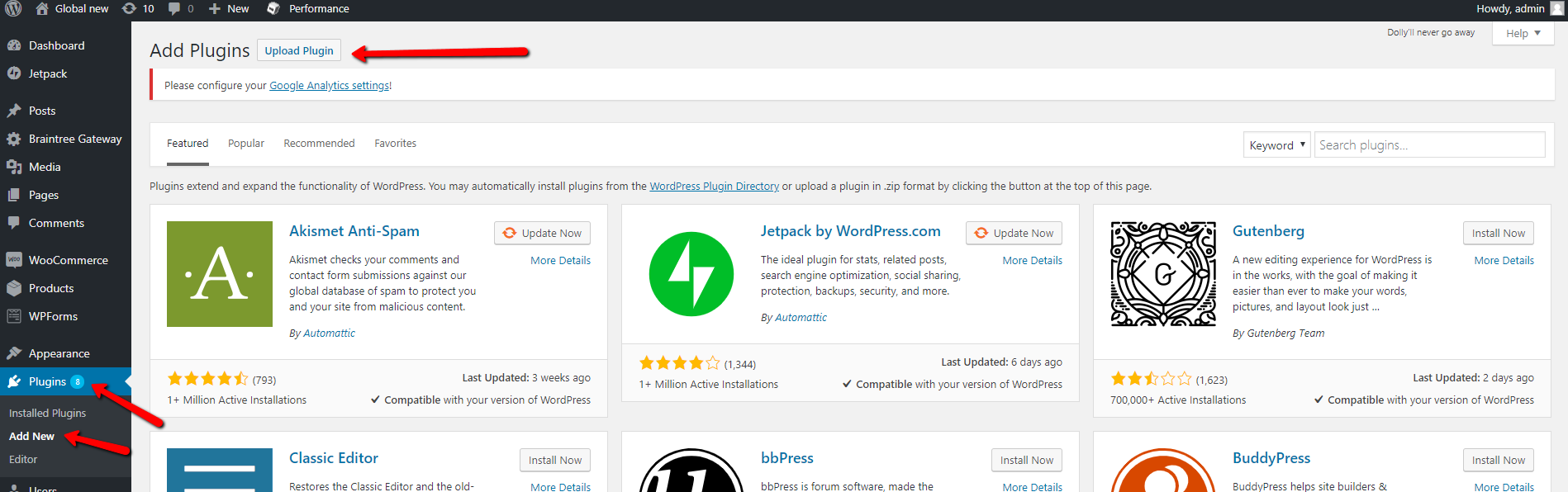 Plugins -> Add new -> Upload plugin -> Choose file -> upload -> Install